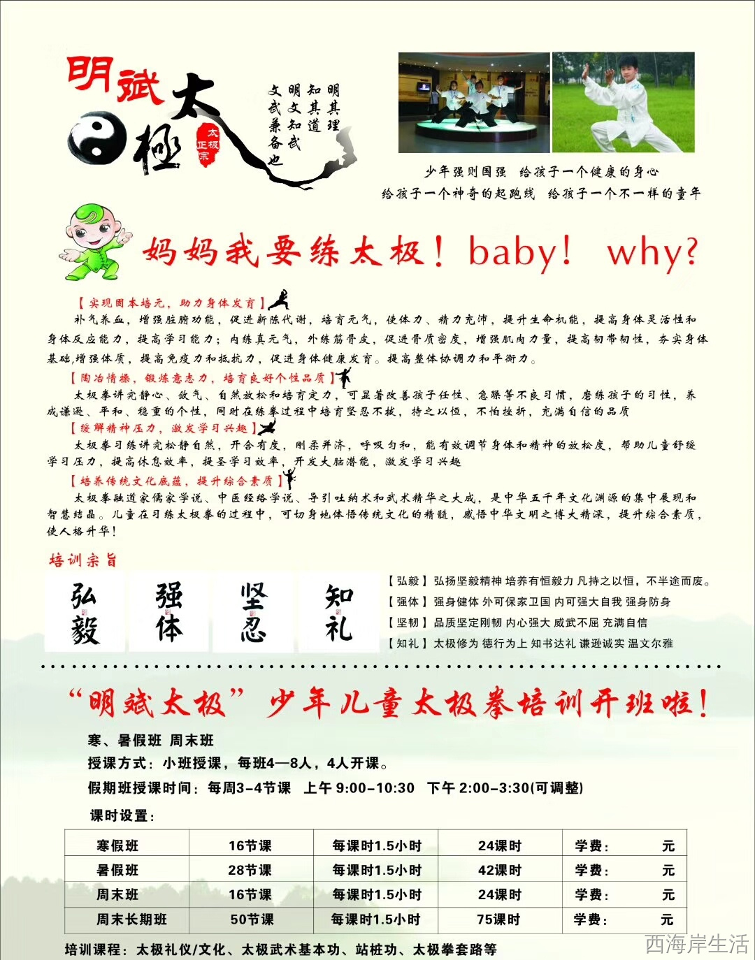 目的:初步了解,近距离感受太极,通过太极手段增强身体柔韧性,协调性,平衡力,反应能力,培养松静控制能力,濡养性格,培养坚韧性格,提升身心健康水平!