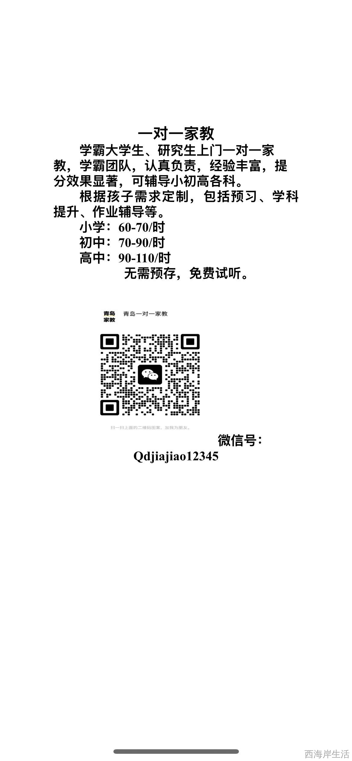 青岛一对一大学生上门家教,均有教学经验,小初高都有,都是海大石油大山科大等学校的老师,可以协助孩子课前预习,放学后辅导陪优等,上门教学,省下孩子时间。需要可加v:Qdjiajiao12345
