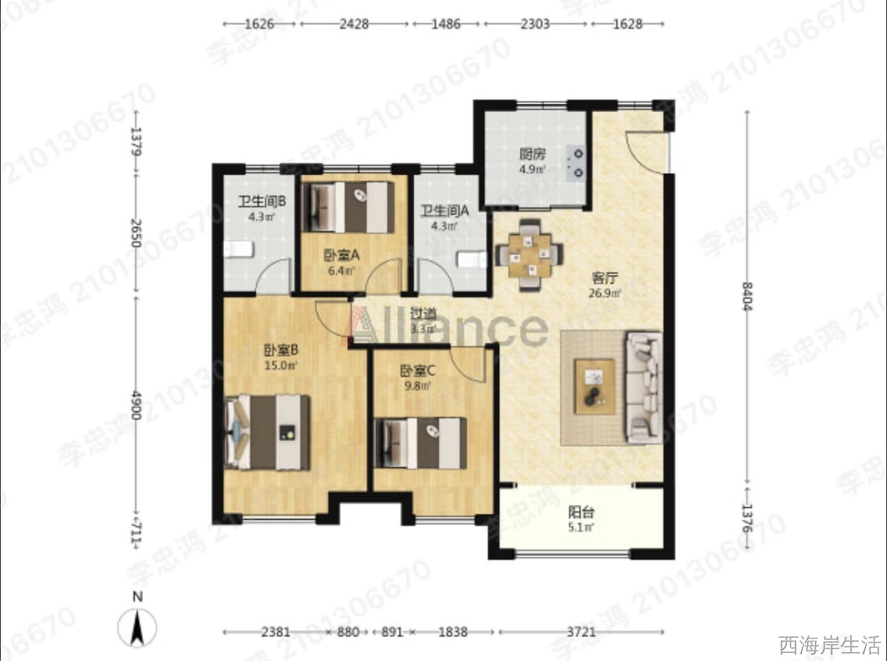 117平三室两厅两卫122万 拎包入住