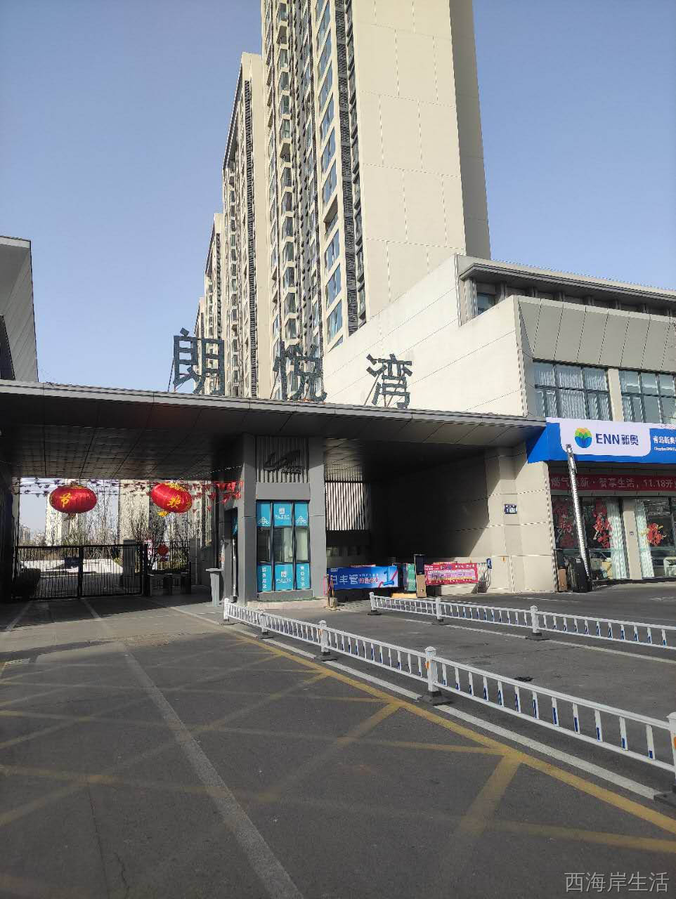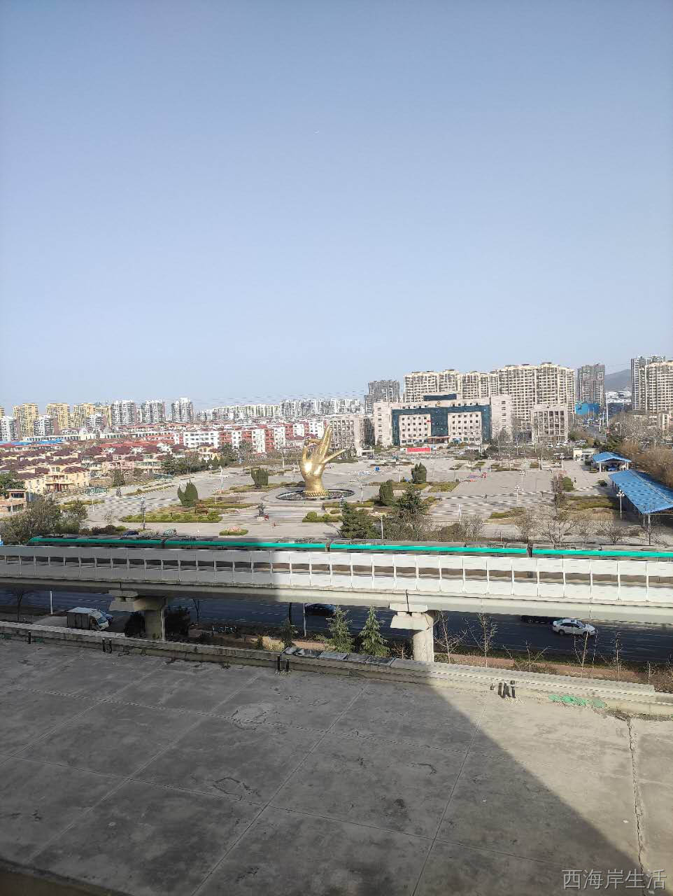 西侧临近地铁站,北侧是隐珠广场,党政办公中心,南侧是城市阳台,可见海中的灵山岛。